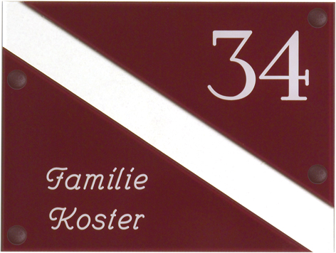 Gravoglas is een luxe en tegelijk stevige kunststofsoort (3 mm dikte), met de uitstraling van gekleurd glas, welke uitstekend geschikt is voor gebruik in en rondom uw woning. De tekst wordt in alle gravoglas-naamborden gegraveerd, waardoor uw naam niet weg kan slijten of vervagen. Het bijzondere aan gravoglas is dat het aan de achterzijde ingegraveerd wordt, dit in tegenstelling tot andere kunststofsoorten. Hierdoor blijft het materiaal aan de voorzijde glad en krijgt het een hele luxe uitstraling. Tot slot: de gravoglas-naamborden zijn standaard voorzien van schroefgaten (tenzij anders vermeld) en worden geleverd met afstandbusjes en afdekdopjes waardoor u het naambord eenvoudig op een korte afstand van de muur kunt monteren. Gravoglas een zeer luxe kunststofsoort dat tegen een stootje kan!